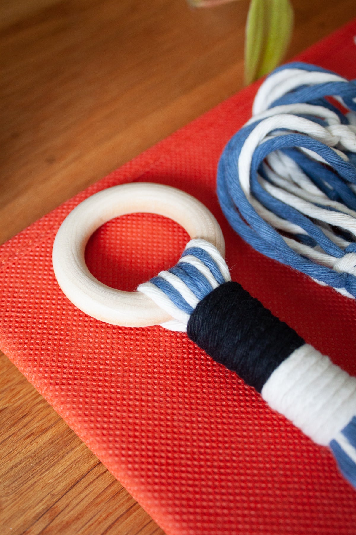 Specifications: Ideally holds 6"-8" potted plants. Hangs approx. 40" from top of loop to end of tassel and 27" from top of loop to the bottom of a 6" terracotta pot. Made on a plain wood loop with black, natural white and cobalt blue accent colors. Made out of recycled cotton cord for indoor use. Colors may vary due to screen display. Pot and plant not included.